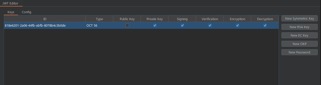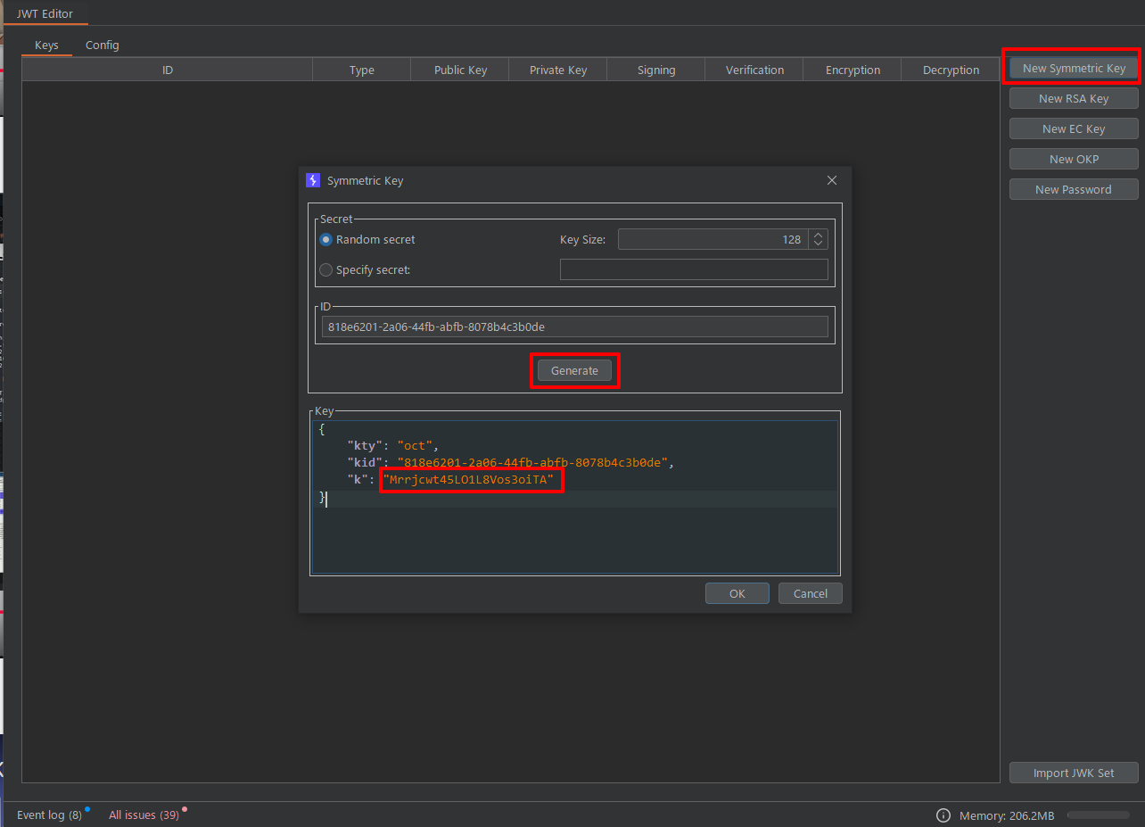 - JWT Editor 탭에서 New Symmetric Key 버튼을 누른다. 그 후에 Generate 버튼을 누른다. 그러면 새로운 키가 생성된다. 여기서 k 의 값을 바꿀 것이다.