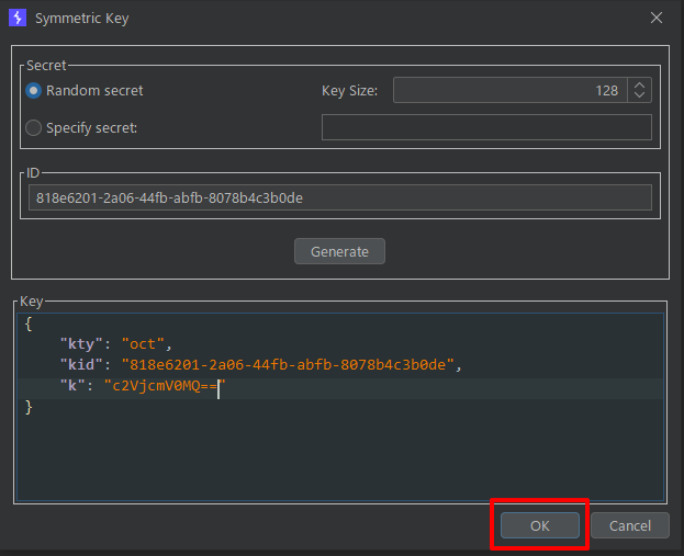 - k의 값을 1번 과정에서 생성해둔 Base64값으로 변경하고 OK버튼을 누른다.