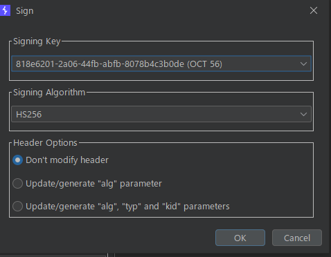 alg는 HS256 으로, Header Options는 Don’t modify header인 상태로 둔다. OK를 누른다.
