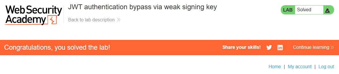- 랩을 풀려면 먼저 웹 사이트의 시크릿 키를 브루트 포스로 알아낸다. 그 후, 알아낸 시크릿 키를 사용하여 세션 토큰을 변조하고, 관리자 패널(/admin)에 접근하여 carlos유저를 삭제하면 된다.